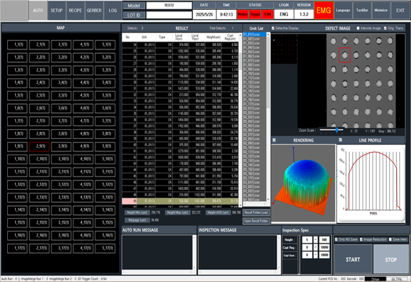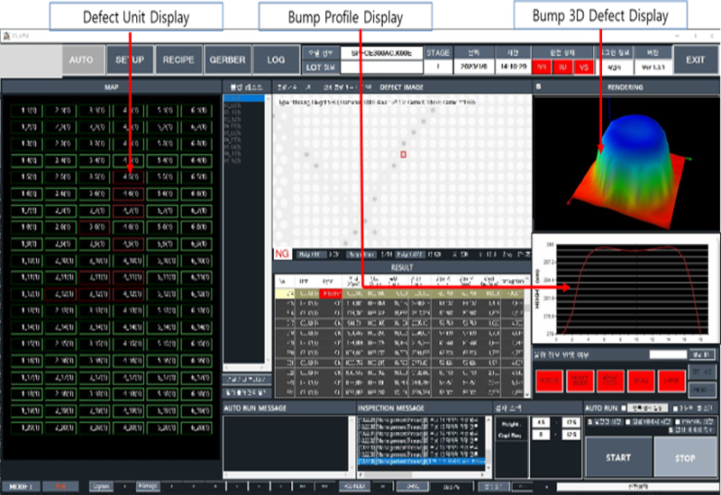 · 반도체 PCB 2D/3D 검사 시스템 · Line Confocal Scanner를 적용하여 Bump높이를 실시간 초고속/초정밀 검사하는 시스템 · 고객사 Spec에 맞는 Scanner Model 적용 · 불량 이미지 및 좌표 VRS 연동 Software · 강력한 검사영역 편집 Software