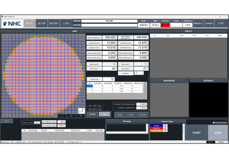 · Wafer Unit의 높이 검사 시스템 · Wafer의 Unit/Dummy/Chip의 높이 측정 및 Crack을 검사. · 간단한 레시피 입력을 통한 Wafer 형상 자동 생성 · Line Confocal 방식을 통한 Wafer 전체 높이 측정으로 데이터 손실 영역 제거 · 3D Line Confocal 모듈을 이용한 높이 데이터 취득 · 높이 측정 알고리즘을 통한 HeightOver / HeightUnder 검출 · 높이 측정과 동시에 Crack검사